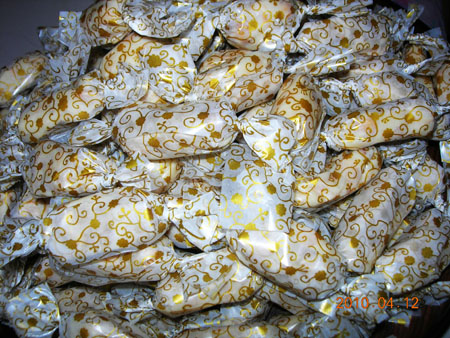 以前是用糖果紙人工包,現在有機器了,